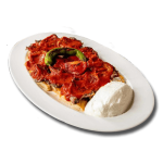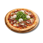 Tomate, mozzarella, copeaux de parmesan, pastirma, huile de truffe, billes de bufala, roquette