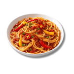 Sauce tomate, spaghetti, poivrons, oignons, piment fort